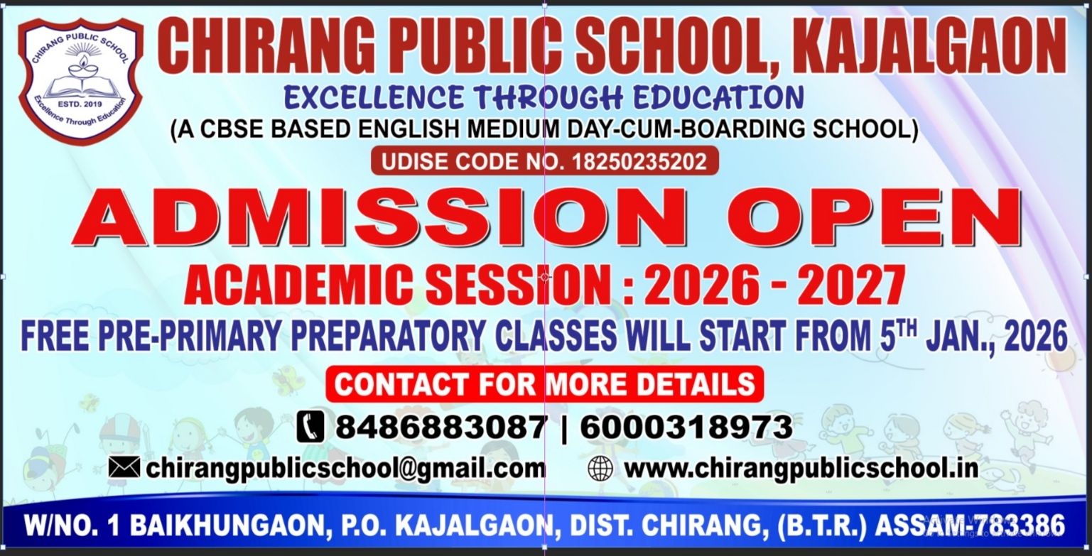 Admission Open 2026-2027By Chirang Public School / December 31, 2025 Admission Open 2026-2027 Free pre-primary preparatory classes will begin on 5th January, 2026.For further details, please contact the school office.